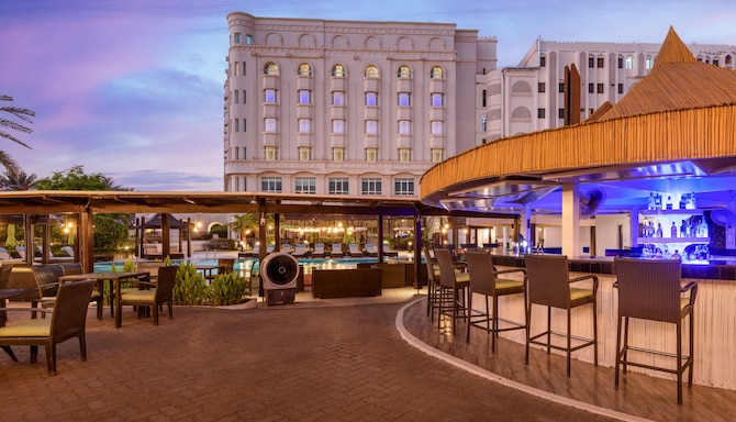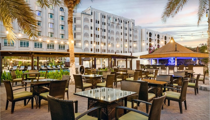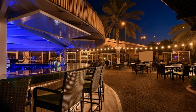 تلذذ ببعض المأكولات الشهية الخفيفة مع مشروب، أو اختر تناول وجبة كاملة، أو اقضِ جزءًا فقط من اليوم، أثناء وجودك بعيدًا عن المنزل، في تدخين الشيشة في مطعم حديقتنا الوارفة المفتوحة في الهواء الطلق وفي البار الموجود بجوار حمام السباحة.