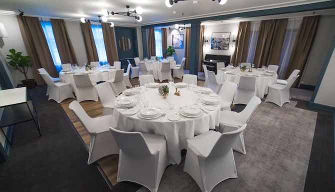 Afhold dine mest eksklusive events for op til 16 personer i vores nyligt opgraderede lokale Kabinettet. Dette stilfulde rum har en smuk udsigt over havneområdet Bryggen og et rummeligt spisebord, hvor alle gæster kan sidde sammen. Dette afslappede loungeområde er perfekt til at mingle før eller efter middagen. Vores catering sikrer smagfulde måltider, der tilpasses dine ønsker.