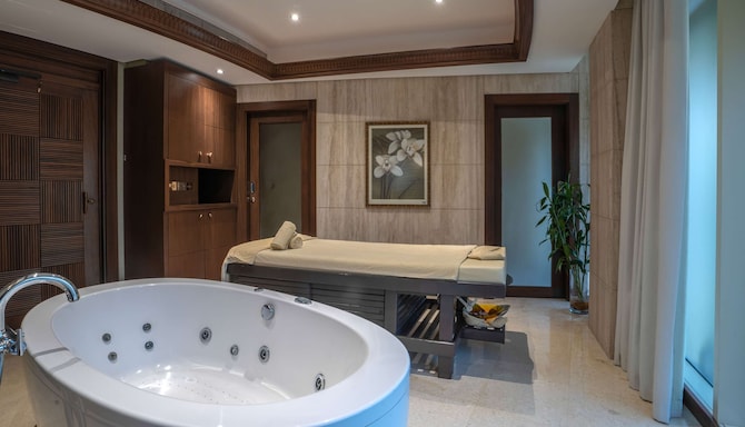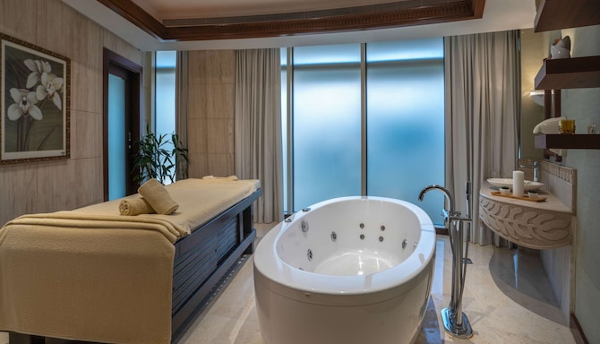 Entdecken Sie unser Wellnesscenter im The Diplomat Radisson Blu Hotel, Residence & Spa, Manama. Unsere 1.500 Quadratmeter große Indoor-Anlage ist mit hochmodernen Technogym-Geräten ausgestattet, und unsere Trainer bieten individuelle Unterstützung für ein effektives Training. Entspannen Sie sich in unserem Spa-Bereich, der vollständig mit Whirlpool, Dampfbad und Sauna ausgestattet ist. In der Halle können Sie Squash und Tischtennis spielen und im Freien können Sie sich im Basketballstadion und auf dem Paddelplatz austoben.