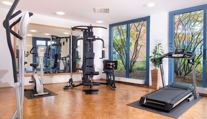 Behalten Sie Ihre Fitnessziele in unserem weitläufigen Fitnessstudio im Auge und genießen Sie den Panoramablick von der angrenzenden grünen Dachterrasse.