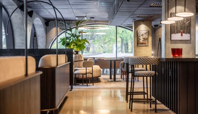 Treffen Sie sich am Abend in unserer trendigen Bar und genießen Sie einzigartige Cocktails. Im Sommer öffnen wir unsere Terrasse, die sich über den herrlichen Kaisaniemi-Park erstreckt.