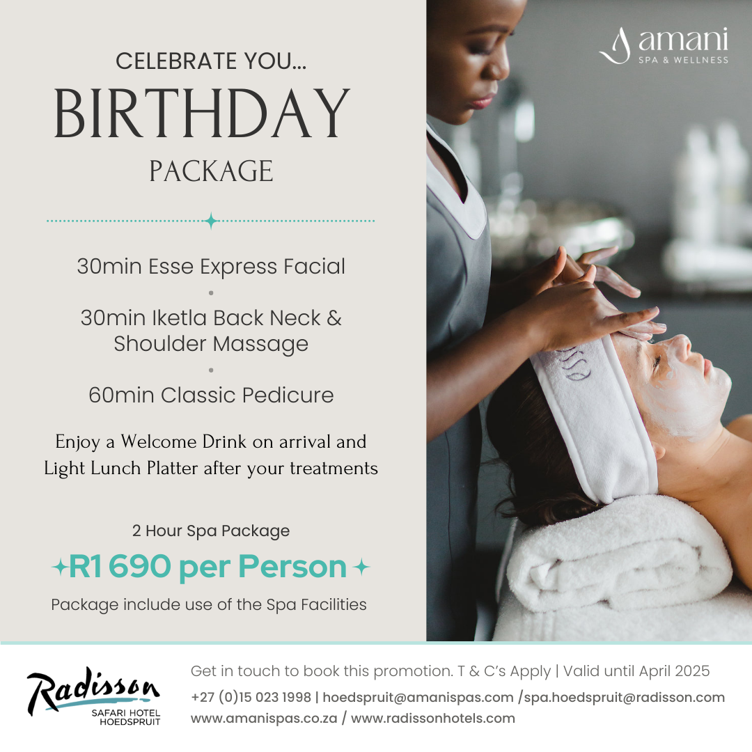 Verbringen Sie einen erholsamen Tag im Amani Spa im Radisson Safari Hotel Hoedspruit. Mit seinem Pflanzendach und dem inspirierenden Blick auf die umliegenden Wiesen ist unser Spa ein Ort der Entspannung und Revitalisierung. Gönnen Sie sich eine Vielzahl von erfrischenden und verwöhnenden Behandlungen in fünf Behandlungsräumen. Das Spa verfügt über eine Wellness-Bar, einen Haar- und Nagelsalon, ein wohltuendes Dampfbad und einen Swimmingpool. Für einen romantischen Tag mit Ihrem oder Ihrer Liebsten buchen Sie eine Behandlung in unserer Paar-Suite.