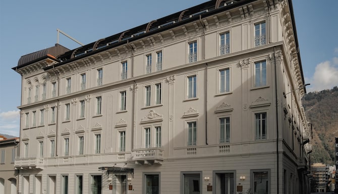 Originally opened in 1926, the historic palazzo reflects the architectural refinement of early 20th century Como. The restoration thoughtfully preserves original façades, rounded corner volumes, stone cornices, and geometric motifs while introducing clean lines, premium materials, and a warm, contemporary palette.