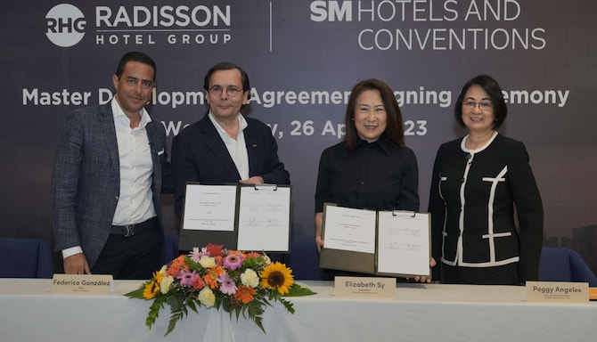 Image: (L-R) Radisson Hotel Group (RHG) APAC Chief Development Officer Ramzy Fenianos, RHG Chief Executive Officer Federico González, SM Hotels and Conventions Corp. (SMHCC) President Elizabeth Sy, and SMHCC Executive Vice President Peggy Angeles, at the Master Development Agreement (MDA) signing ceremony.