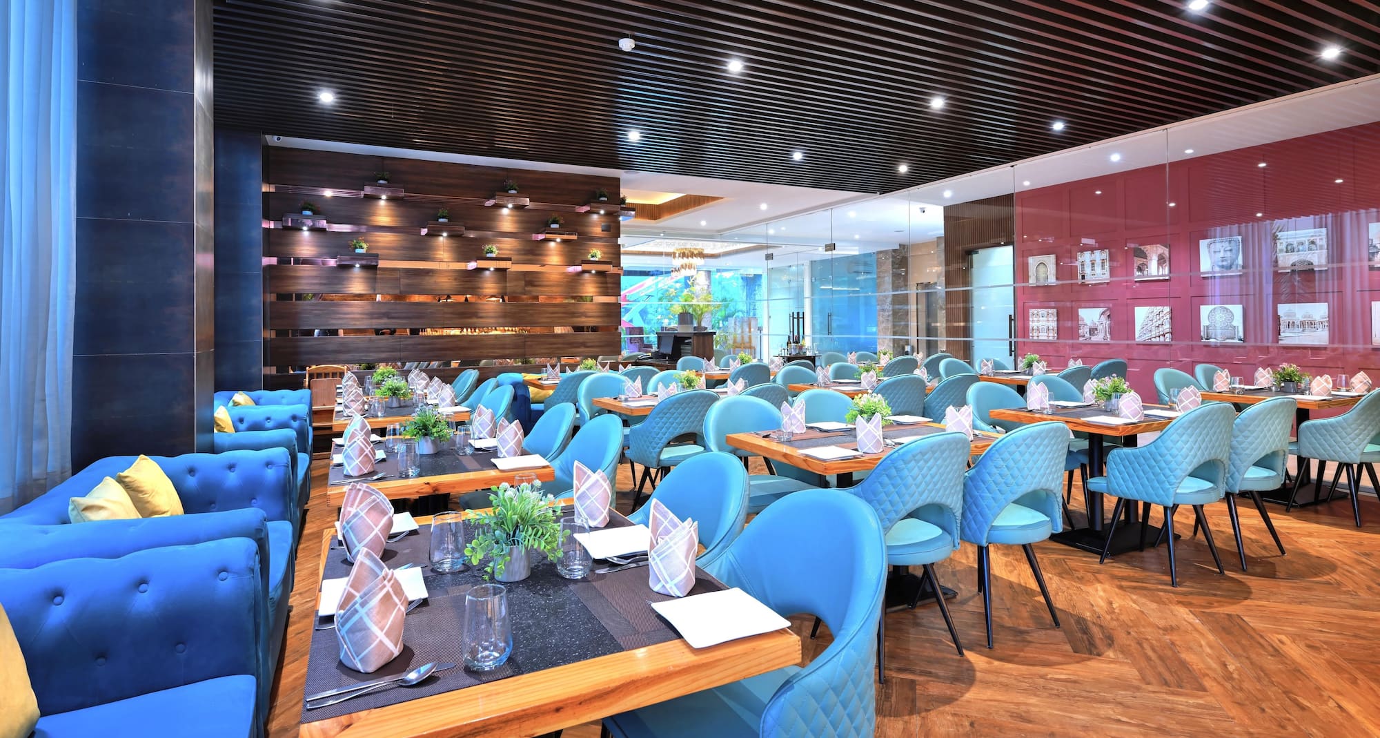 At Golden Tulip Agra, culinary variety meets carefully crafted experiences across three unique dining spaces. Lantern, our garden restaurant, is a leafy oasis where soft lantern lighting and vertical greenery set the tone for a tranquil meal. Head up to Panora, our rooftop lounge and bar, for sweeping views of Agra and an elevated menu of grilled favorites, cocktails, and light bites. For a more casual yet stylish experience, Sumac serves international cuisine in a modern setting designed to inspire. Whether you’re joining us for breakfast, dinner under the stars, or a midday escape, our food and beverage offering adapts to your rhythm, your taste, and your mood.