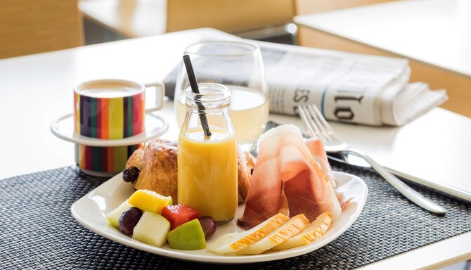At our on-site eatery, La cuis'inn, we offer tasty cuisine for you to enjoy all day long. Begin your day with our breakfast buffet featuring options for all tastes and dietary preferences. For lunch or dinner, choose from classic dishes like pasta, salads, and regional dishes. Bask in the sun and savor barbecue dishes in our patio during the warmer months. If you're leaving early, in a rush, or just looking for a quick snack, our 24-hour takeaway kiosk offers a selection of drinks, desserts, sandwiches, and snacks.