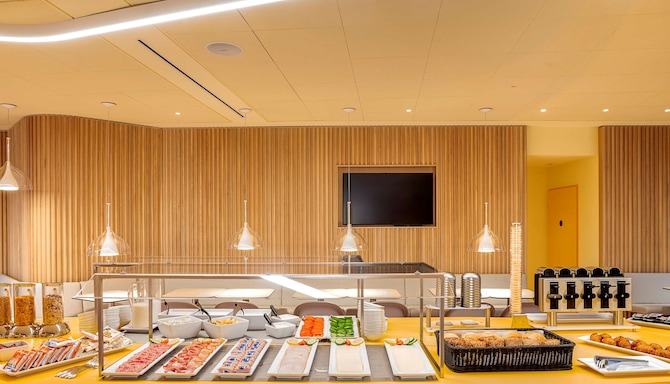 Our 195 rooms are designed for comfort and style, featuring a king-size bed, rainforest shower, underfloor heating, and soundproof windows for a restful stay. Enjoy sustainable housekeeping, cashless payments, fast free WiFi, and a 24/7 lobby bar for added convenience. Whether you're here for business, culture, or to explore Münster’s renowned bike-friendly streets, everything you need is right here.Breakfast Area