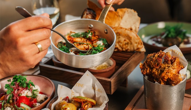 Balaustine serves vibrant, spice-filled dishes and punchy Barbary Coast-inspired cocktails. Experience fresh, bright flavors and bold textures with meat and vegetables cooked over charcoal.
