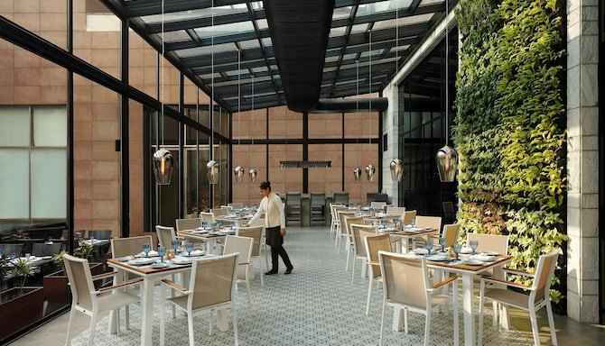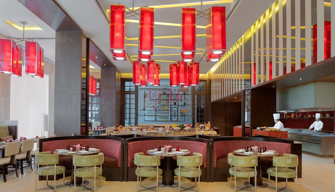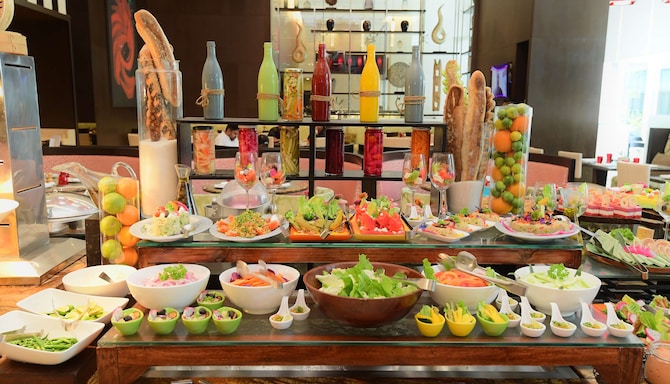 Sample flavors from around the world at the Radisson Blu Hotel Guwahati. Our five on-site restaurants offer distinctive options for quick meals, fine dining, and informal get-togethers after an on-site meeting. Indulge in a variety of authentic pan-Asian dishes prepared in the show kitchen at NestAsia. Café B-You serves international cuisine with an emphasis on Indian and Mediterranean dishes, along with an extensive all-day menu. You can also choose The Patio to experience a diverse menu. Or enjoy vegetarian and meat kebabs at The Great Kabab Factory, baked goods at Dolce, and refreshing cocktails at Reign.