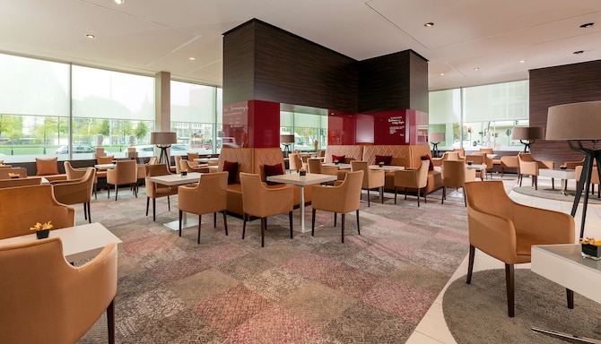 At Radisson Blu Hotel, Leipzig, you won't need to leave the hotel to enjoy a delicious meal. Each morning, enjoy a buffet full of your breakfast favorites as well as fresh juice, coffee, and tea. Later on, stop by for lunch or dinner—our menu offers a selection of great-tasting international dishes. After a long day, unwind at our lounge bar with a glass of wine or a cocktail.