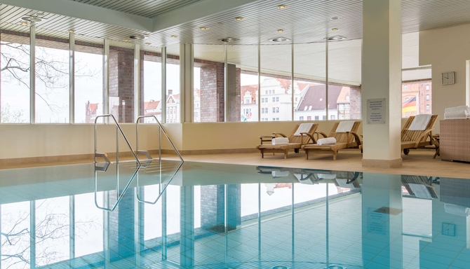 Relax your body and calm your mind in our wellness area in Lübeck. Enjoy a relaxing dip in our heated indoor pool with views of the Old Town for the perfect end to a busy day.