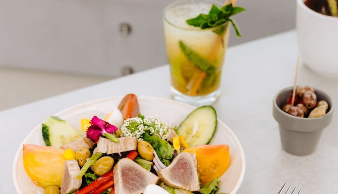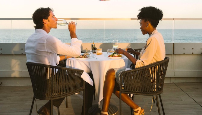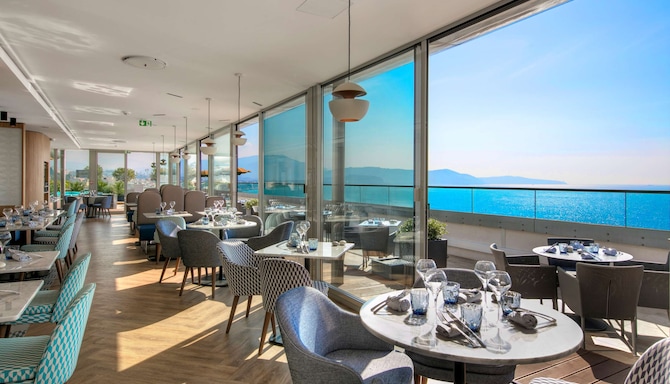 The largest rooftop restaurant in Nice, Calade Rooftop Restaurant offers an exceptional panoramic view of the Promenade des Anglais and the Mediterranean Sea in a contemporary atmosphere. The decor matches the picturesque nature providing an ideal setting where you can treat your senses to an exceptional experience. Take in the spectacular vistas of the region as your taste buds relish the delicious meal whipped up by our chef with fresh, seasonal ingredients. Open all year for lunch and dinner, the restaurant is an ideal venue for your business lunches, family meals, or evenings with friends. The flavors of Nice take pride of place in the menu with dishes prepared using fresh and seasonal products of the region along with a varied selection of regional wines and beers.