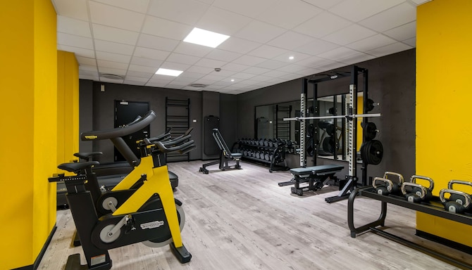 Visit our modern fitness area, featuring cardio machines such as treadmills, bikes, and a cross trainer, as well as a selection of free weights and a bench press for strength training.