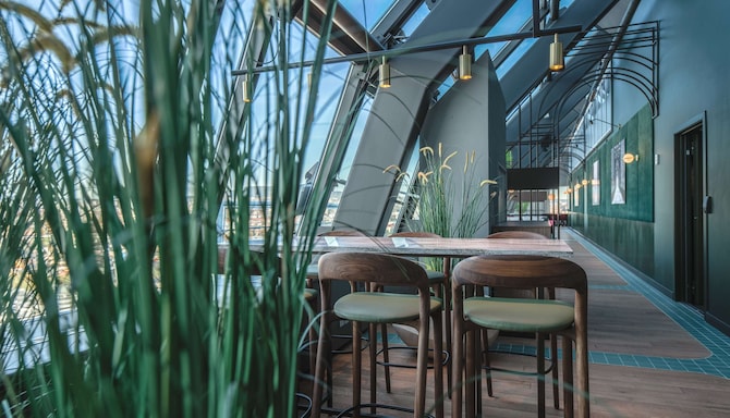 Take our glass elevator and climb up 110 meters in just 50 seconds. At the top, our stunning 34th-floor rooftop terrace awaits, offering panoramic views of the entire city and the Oslo Fjord. Whether you're looking to enjoy a tasty lunch or a cozy dinner, we offer something for your every mood.