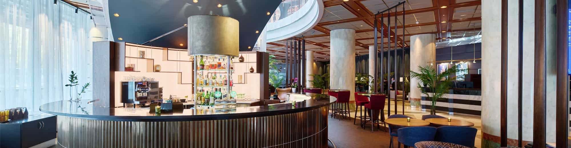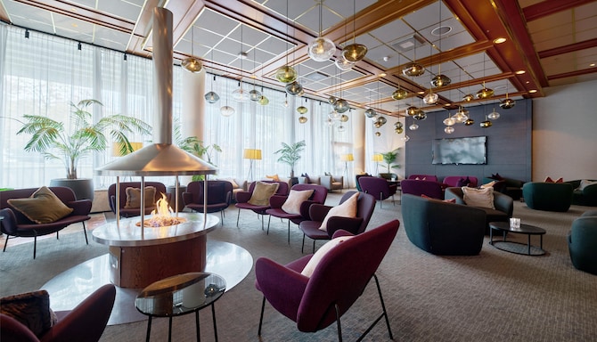 Enjoy a relaxing break with a wide selection of drinks and a tempting menu of lunch and dinner options at our lobby bar, conveniently located inside the hotel entrance. With a stylish interior design, our bar offers a welcoming atmosphere. Whether you're in the mood for a refreshing cocktail, a non-alcoholic beverage, or a delicious meal, there's something for everyone.