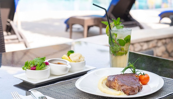 Warm and friendly service delivers your orders of refreshing drinks, light snacks, or heavy meals while you lie on your sunbed. Enjoy the vibrant alfresco setting, or opt for a more relaxed and casual meal in the airy dining room.