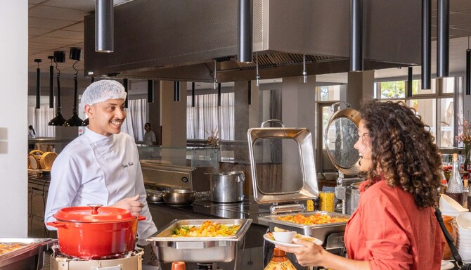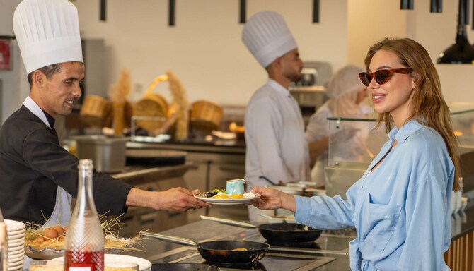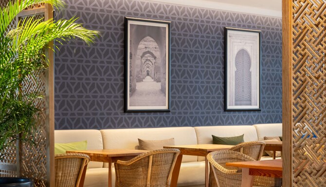 Moroccan delicacies, fresh fish, and homemade desserts await at The Cedar Restaurant. Explore our buffet to discover new flavors and dishes made with fresh, locally-sourced ingredients. Overlooking the pool, the restaurant's terrace offers a warm and welcoming atmosphere, perfect for sharing a meal with friends and family. The Cedar is open for breakfast, lunch, and dinner, and caters to a variety of dietary preferences including gluten-free, dairy-free, and vegan options.