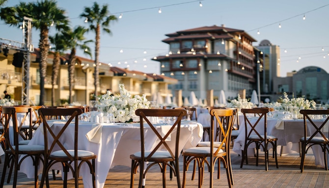 Relax in one of our stylish rooms or suites—many offering private balconies and separate living areas with captivating sea views. Every detail of the resort, from guest rooms and restaurants to the spa and shared spaces, has been beautifully redesigned to offer a more contemporary and comfortable atmosphere. With two restaurants and three bars on-site, you’ll find a variety of dining options just steps from your room. Perfect for families, our beachfront resort also features a playground and a Kids' Club—so you can indulge in a spa treatment or a traditional Turkish hammam while your kids are entertained and well cared for.