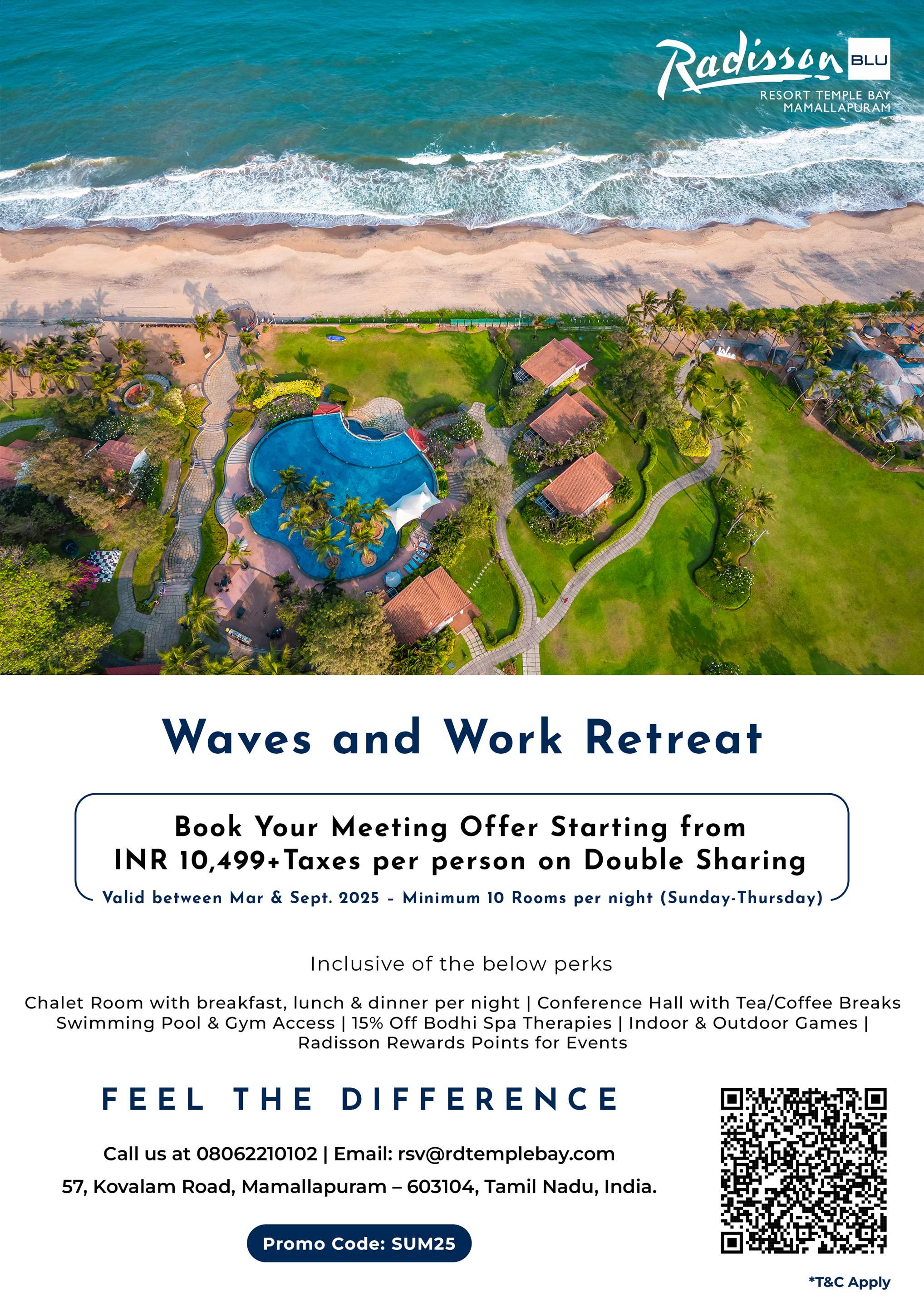 For corporate affairs, our Cabin Room provides a perfect setting, featuring stunning shoreline vistas and equipped with state-of-the-art audiovisual equipment. Complement your event with our flexible catering options, seamless videoconferencing capabilities, and the convenience of our Sundial Business Center. Your special occasions and business meetings are destined for success at Radisson Blu Resort, Temple Bay Mamallapuram.