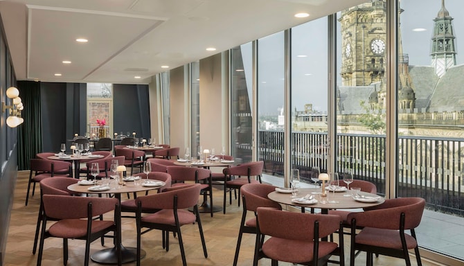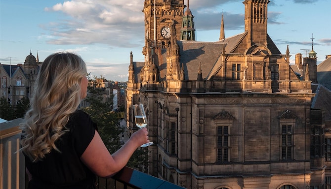 Elevate your dining at The Rooftop, located on the third floor of the hotel. The restaurant and bar offer vistas of the city and beyond. Sit on the outdoor Pommery Champagne terrace and enjoy unbeatable views of the Town Hall and Peace Gardens, or discover our stylish indoor areas with cozy booths and sociable long tables.
