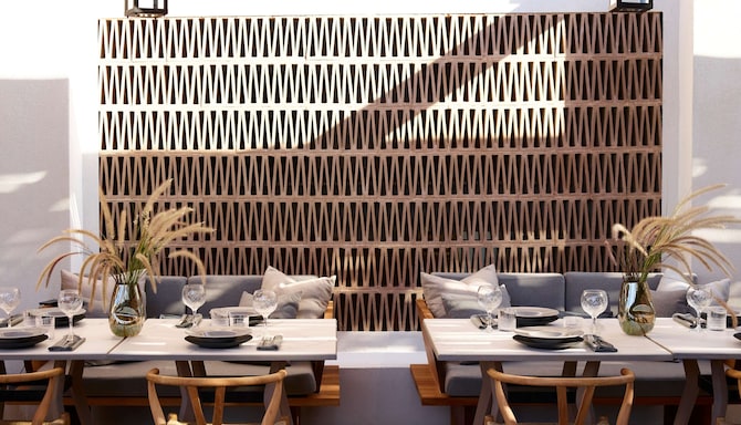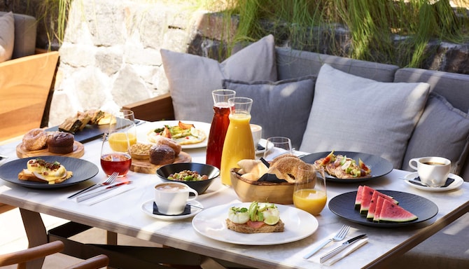After a day under the Aegean sun, unwind at Zaffron and savor local white wine amidst relaxing surroundings. Indulge in a dining experience with a selection of Mediterranean cuisine, traditional dishes, and fine wine. Refresh with a dip in the pool then enjoy specialty coffee. In the evening, indulge in cocktails as you enjoy the tranquil ambiance, for a memorable experience in Santorini.