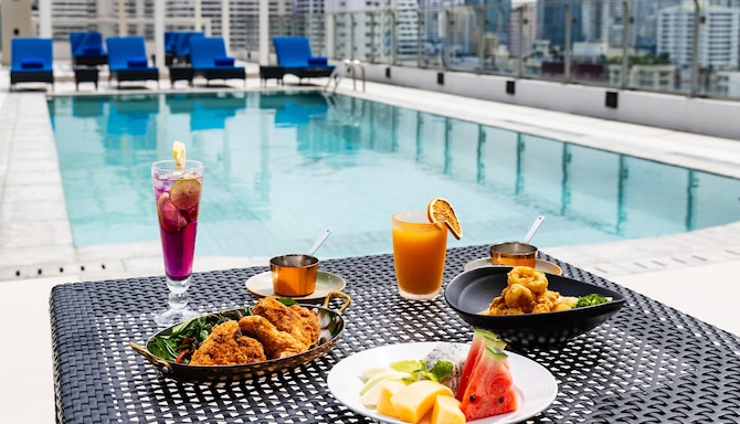 Located on the 12th floor next to the swimming pool, the View Pool Bar is perfect for spending a relaxing day in the sun. Savor our delightful selection of snacks and refreshing drinks while unwinding poolside and admiring our rooftop’s stunning city views.
