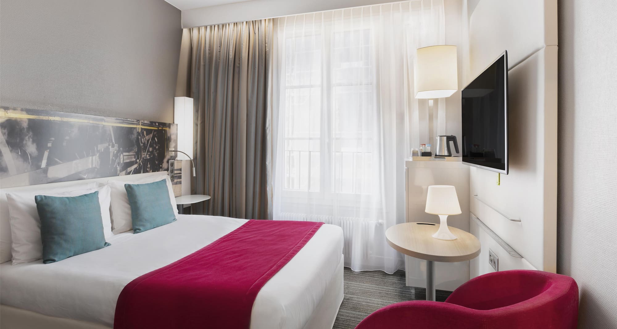 Step into one of our 45 uniquely Parisian rooms, combining a cozy atmosphere with contemporary design. Each space is crafted as a haven of comfort, featuring modern amenities and services to ensure a relaxing and effortless stay.