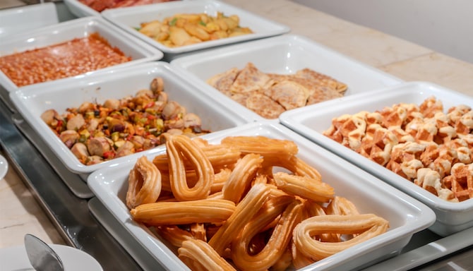 Guests can start the day with a breakfast buffet, enjoy a la carte lunch or dinner at Los Lances Restaurant, or unwind with cocktails and sunset views at the rooftop Sky Bar.