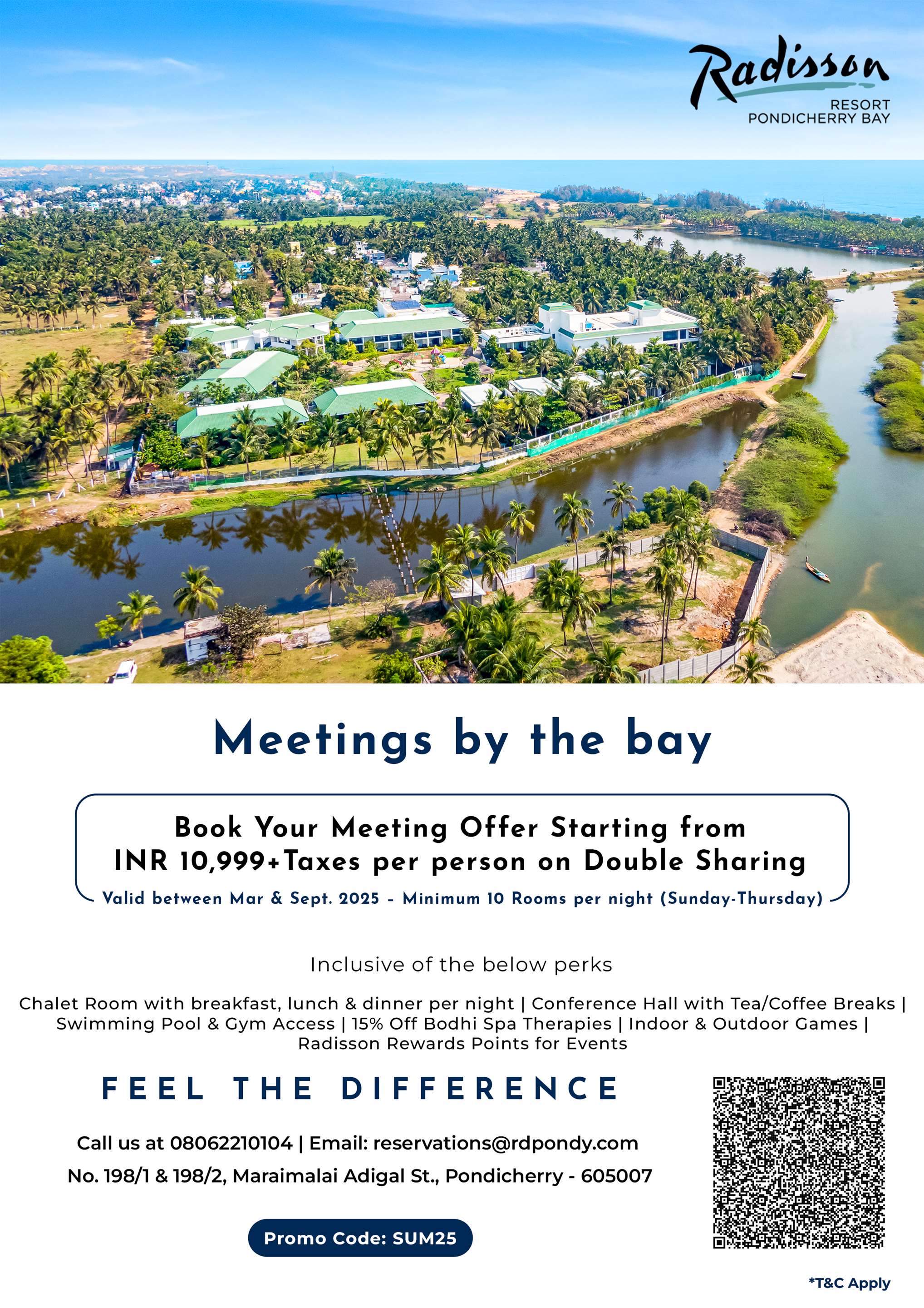 The Radisson Resort Pondicherry Bay's meeting and event facilities offer an outstanding blend of luxury and natural beauty. Our resort, located near a tranquil lagoon and gorgeous beach, provides an unrivaled setting for your special events. We ensure that your gatherings are magnificent, unforgettable, and ideally adapted to your demands. With 20,300 square feet of space, our adaptable banquet room effortlessly integrates indoor and outdoor facilities, allowing you to host events that take advantage of the lush, tropical surroundings while also providing the sophistication of an inside setting. Our resort has the appropriate venues to realize your ideas, whether it's a romantic beachside wedding, a corporate conference, a gala supper, or an exclusive business meeting. Our boardroom provides a secluded retreat for crucial meetings and decision-making for individuals preferring a more private and executive setting. It is outfitted with cutting-edge technology to enable smooth presentations and debates. Our professional events team is dedicated to offering outstanding service by thoroughly planning and executing every detail. We strive to provide an amazing experience for you and your guests, from culinary delights created by our famous chefs to personalized decor.