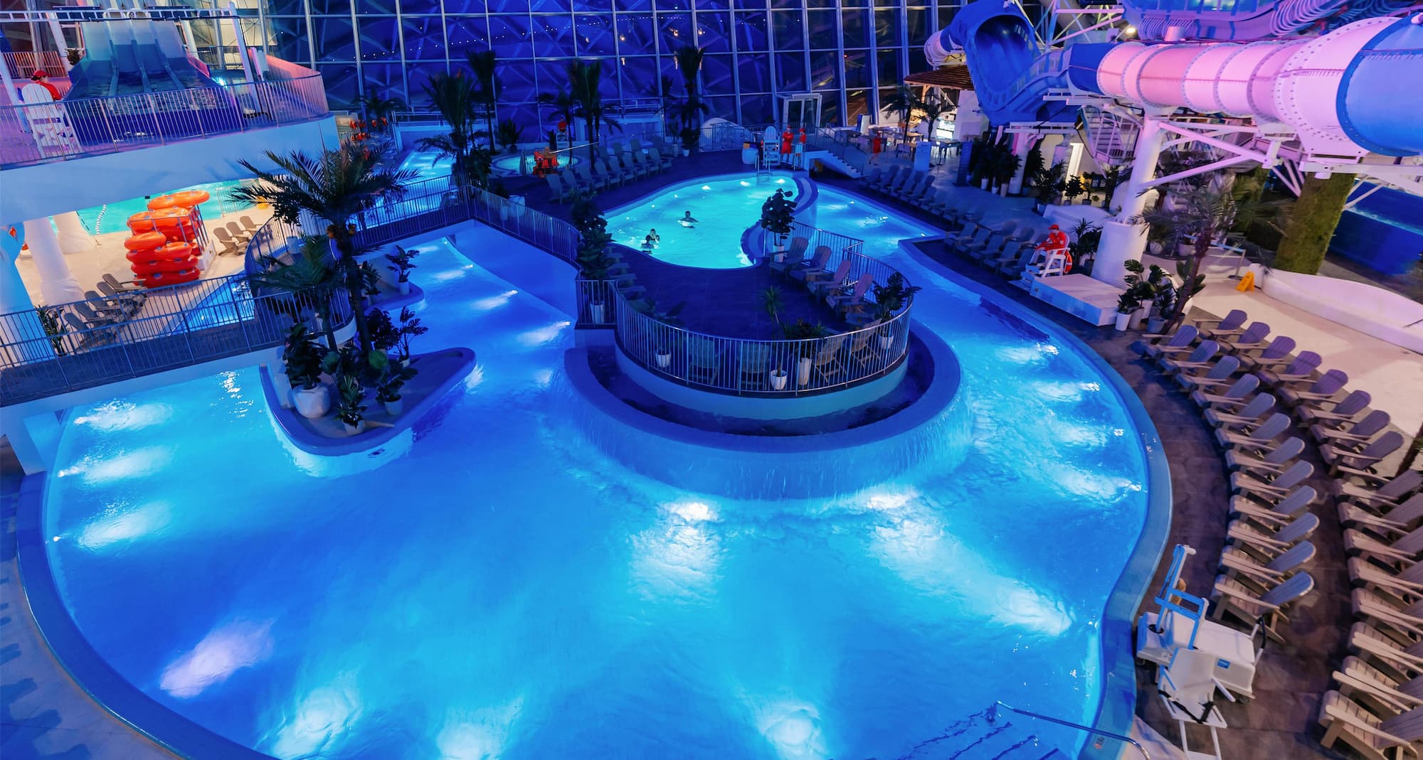 One of the largest indoor water parks in the country with incredible panoramic views of the forest, river and sunsets will allow you to easily transport yourself into summer, regardless of the weather outside the window. The high-tech roof with an open sky effect lets in UV rays, allowing you to bask in the sun and sunbathe all year round.