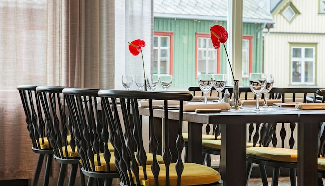 El restaurante y bar Charly’s ofrece un menú a la carta y de temporada con una deliciosa selección de tartar de salmón, filete de reno y pescado seco a la parrilla.