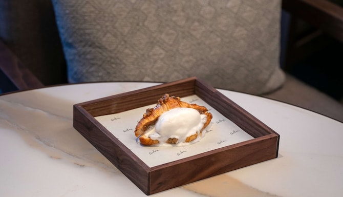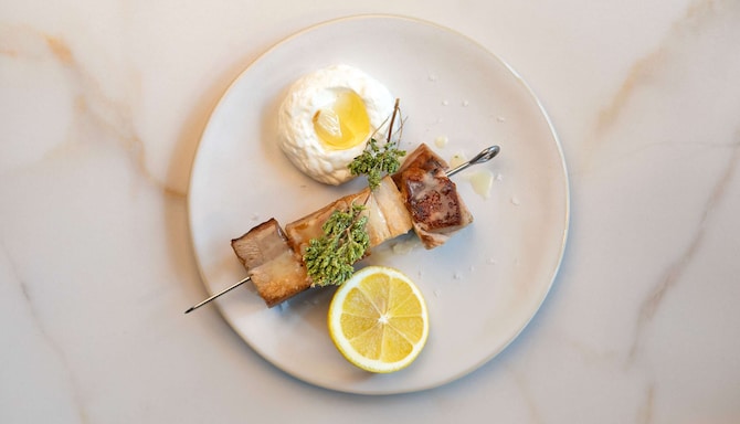 El menú combina modernidad y atemporalidad. Así, al fusionar la cocina tradicional y la contemporánea, San Éna consigue el equilibrio ideal entre composiciones creativas y sencillez.