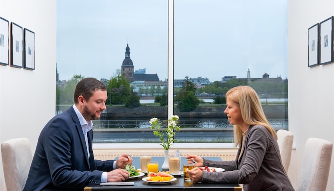 Nauti päivittäin tarjoiltavasta Super Breakfast Buffet -aamiaistarjoilusta valoisassa ja modernissa ympäristössä, josta on näkymät rauhallisesti virtaavalle Daugava-joelle. Herkuttele runsaalla valikoimalla vastaleivottuja leivonnaisia, perinteisiä latvialaisia kakkuja ja alueellisia erikoisuuksia, kuten tumma ruisleipä, artesaanijuustot, savustetut lihat ja lämpimät puurot. Tarjolla on myös kansainvälisiä suosikkeja sekä kasvis-, vegaani- ja gluteenittomia vaihtoehtoja.