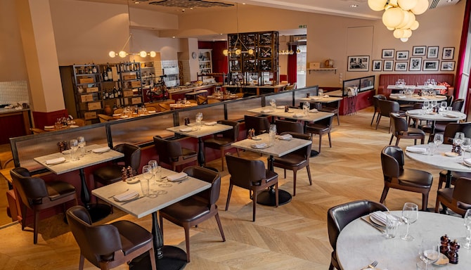 Un joli restaurant avec une ambiance tamisée et une cuisine ouverte.