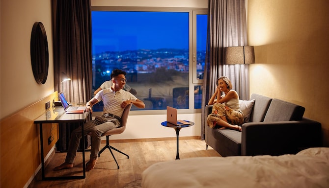Détendez-vous dans nos chambres et suites élégantes et actuelles, chacune dotée de couleurs neutres, de touches modernes soignées et de grandes fenêtres pour profiter de la lumière naturelle et d’une vue superbe sur la ville ou le lac. Détendez-vous dans un lit moelleux, restez en contact avec le Wi-Fi gratuit et commencez votre journée avec une boisson chaude en utilisant le service à thé et à café fourni dans la chambre.