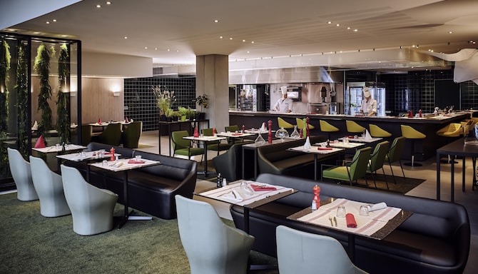 Dînez à l'intérieur dans notre élégante salle à manger ou en terrasse pour un repas en plein air. Commencez chaque matin avec notre délicieux Super buffet de petit-déjeuner ou commandez notre service de chambre. Après une journée bien remplie, faites une pause au bar pour découvrir notre sélection soignée de vins, de cocktails et de collations légères.