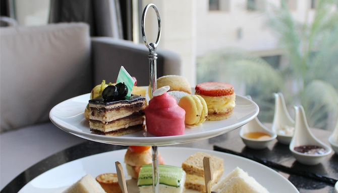 Laissez-vous séduire par la tradition intemporelle du thé complet de l'après-midi au Radisson Collection Muscat, Hormuz Grand, où l'élégance rencontre le confort dans un cadre serein et luxueux. Savourez une sélection raffinée de bouchées salées et de pâtisseries délicates, fraîchement préparées par notre équipe gastronomique et accompagnées de thés en vrac de première qualité ou de café artisanal. Des scones sortis du four aux exquises friandises, chaque élément est conçu pour ravir les sens et sublimer votre après-midi. Partagé avec des amis ou savouré en solo, c’est un moment de plaisir que vous garderez longtemps en mémoire. Servi tous les jours de 14h à 18h.