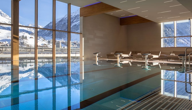 The hotel spa boasts a stunning 25-meter pool with unparalleled views of the Ursern Valley's mountain scenery. Guests can make use of the spacious fitness area featuring with Technogym equipment and unwind in the thermal zone, which comprises two saunas and a steam bath.