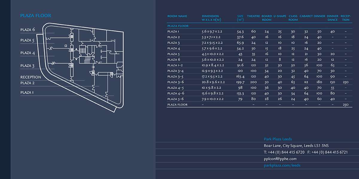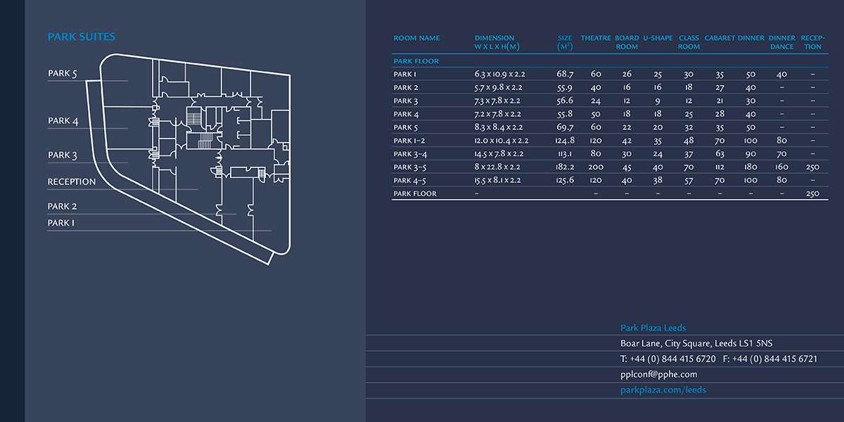 Park Plaza Leeds oferuje elastyczne, najnowocześniejsze zaplecze do obsługi eventów i spotkań wewnątrz oraz na zewnątrz hotelu. Do wyboru jest 11 w pełni wyposażonych sal spotkań z niezbędnym sprzętem oraz odpowiednią przestrzenią do organizacji idealnego wydarzenia.