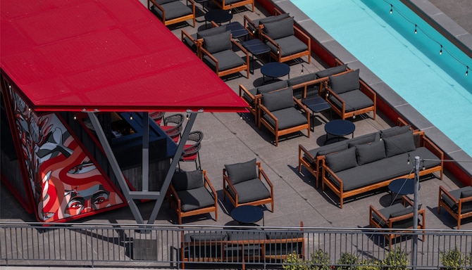 O terraço ao ar livre, a piscina no terraço e o ambiente descontraído com sofás no estilo lounge criam o cenário perfeito para tudo, desde bebidas descontraídas à tarde até encontros animados ao pôr do sol e à noite, tudo isso envolto por um design ousado e a atitude característica do RED.