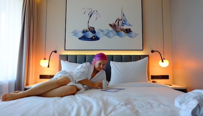 Каждый номер предлагает уникальный взгляд на Ригу: либо на Западную Двину, либо на историческую панораму, либо на внутренний двор с колесом обозрения Riga Rise - новейшей достопримечательностью города на левом берегу.