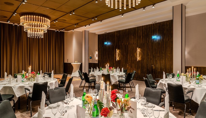 - Rum med dansgolv, bar och festligt dukade bord, blommor på borden enligt dina önskemål, menykort, bordsplacering