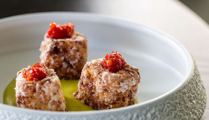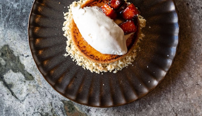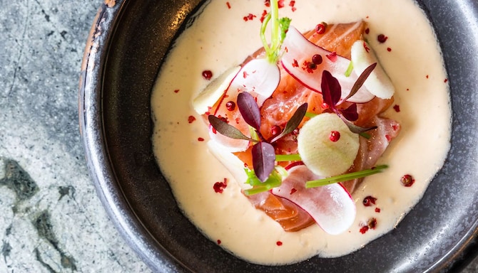 Alla maträtter är skapade av vår kända kock och utformade för att berätta en historia där smakerna harmonierar med drycken till en fest som kommer att glädja dina sinnen. Upplev en unik kombination av lyx, design och kulinarisk perfektion medan du äter i vår panorama-svit omgiven av fantastiska vyer och ikoniska Fritz Hansen-möbler.