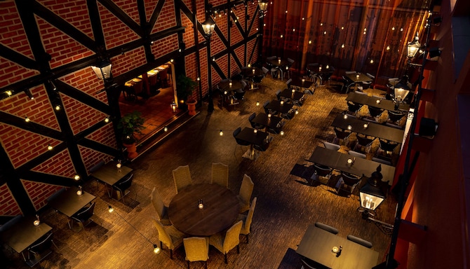 在开放式壁炉旁舒适落座,尽情放松身心,品尝环球佳肴美馔。