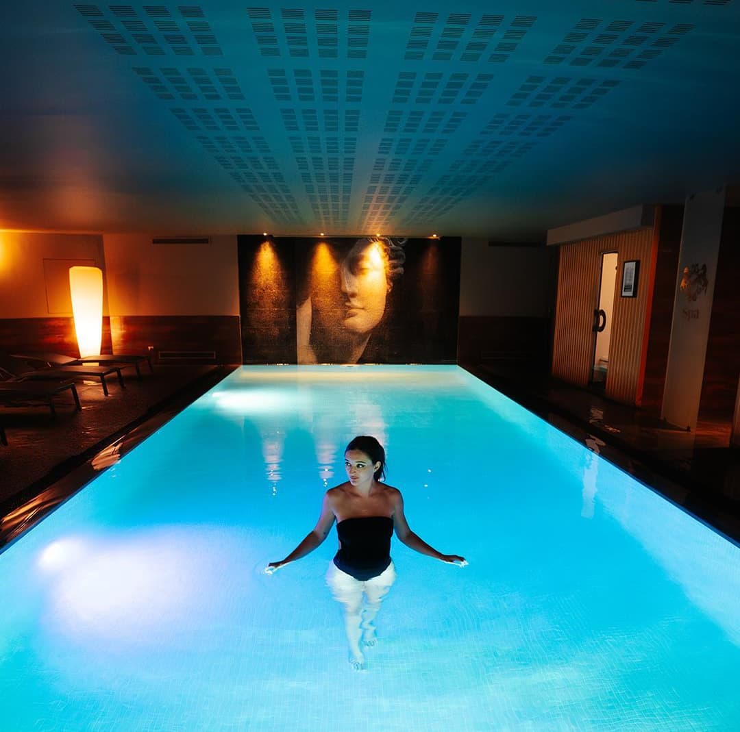 沉浸于温暖的恒温室内泳池,或在漩涡池中感受水的治愈力量。12岁以下儿童在成人陪同下,可于上午12点至下午2点间使用室内泳池。